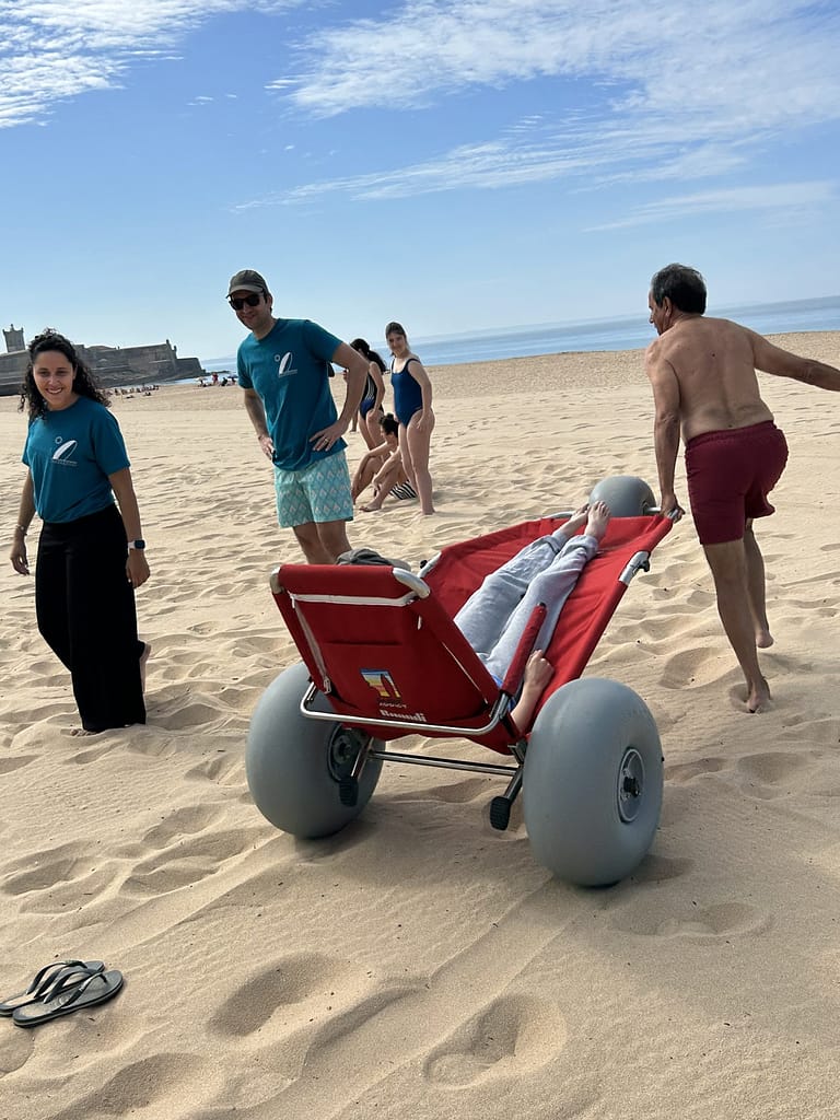 Atividades de lazer e desporto adaptado. Na imagem vemos uma atividade de surf proporcionada pela Associação Portuguesa de Surf Adaptado.
